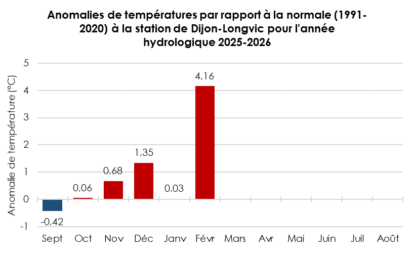 Les températures relevées à la station de Dijon-Longvic au cours des six premiers mois de l’année hydrologique montrent une tendance nettement plus chaude que la normale de référence (1991-2020).