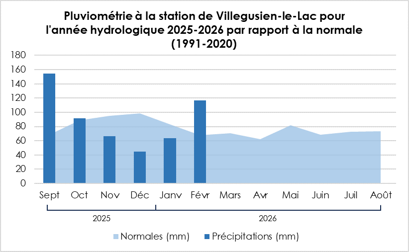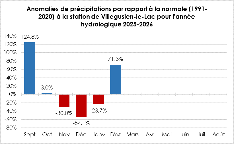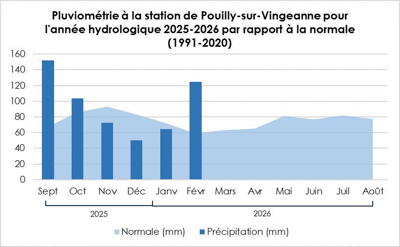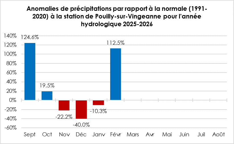 Un retournement important s’est opéré durant le mois de février, avec un excédent de +71,3 % à la station de Villegusien et +112,5 % à celle de Pouilly-sur-Vingeanne. Ce mois très humide relance la recharge des sols et des nappes.