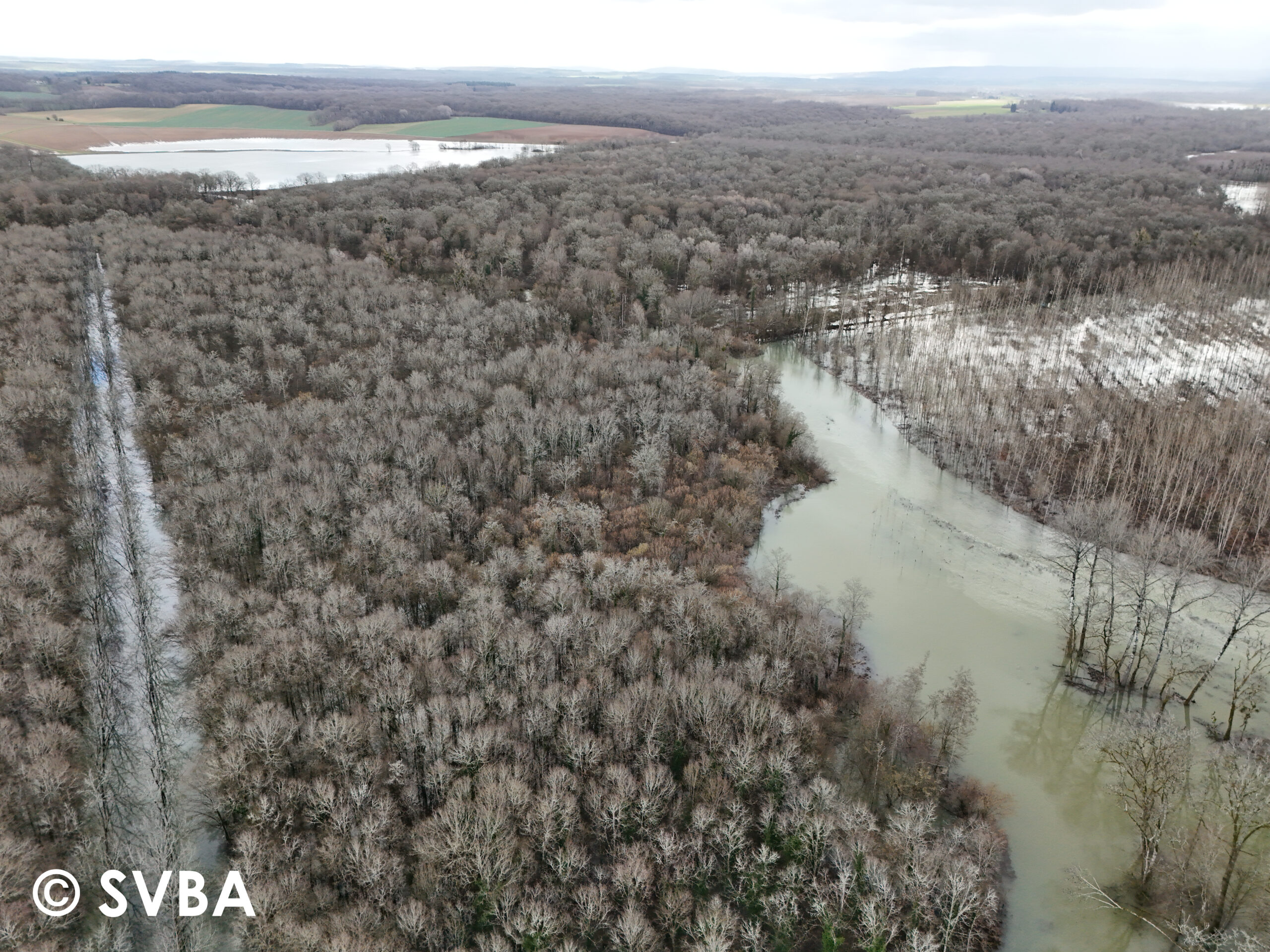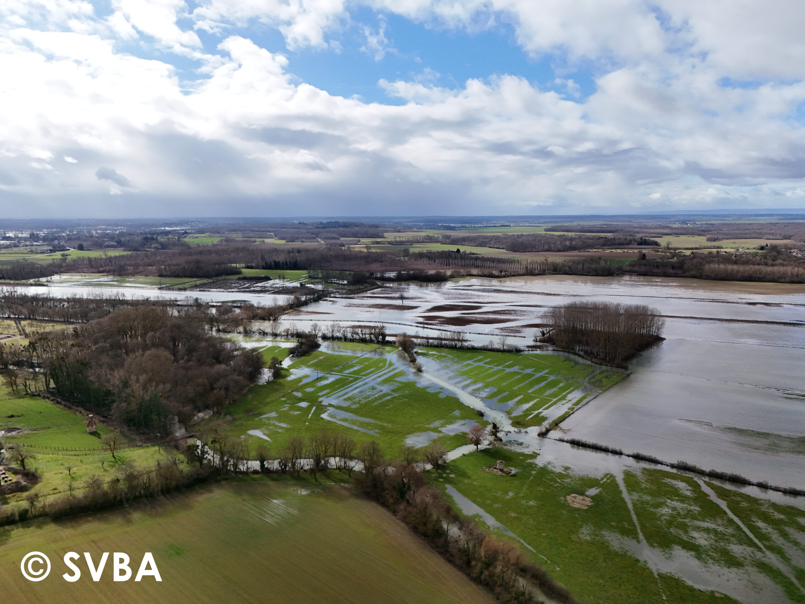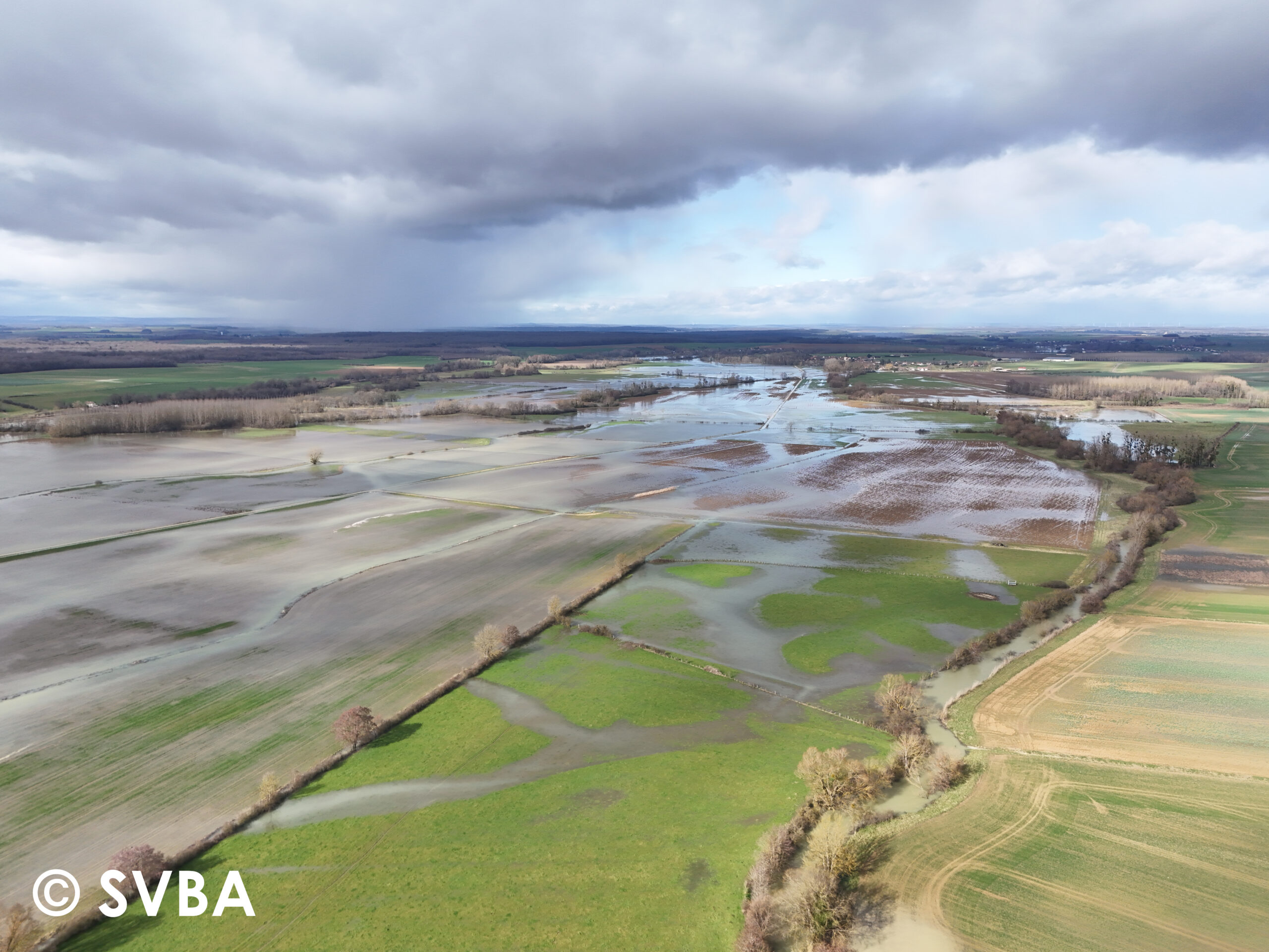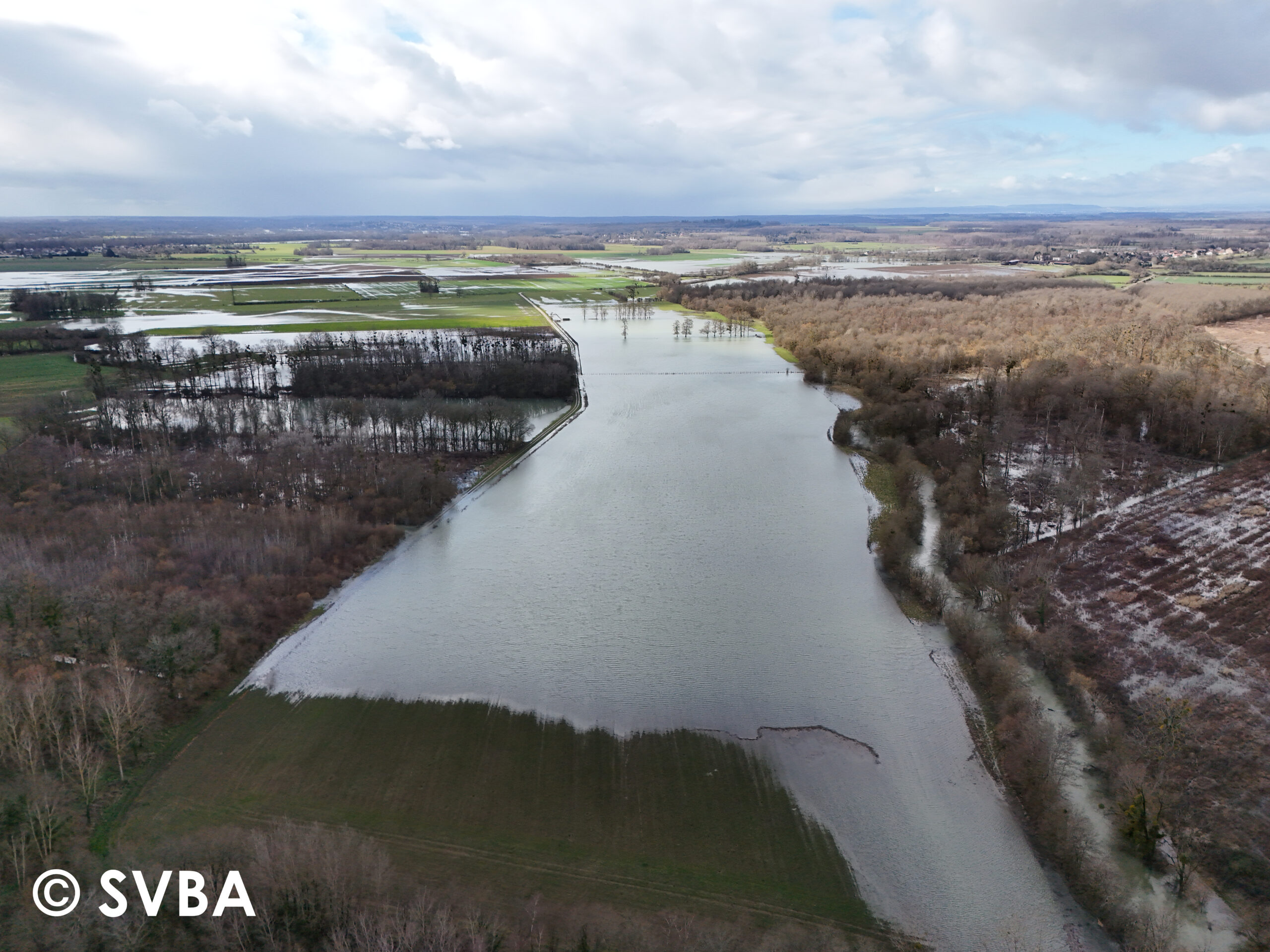 Dans le cadre de la crue de février 2026 un vol a été réalisé le 17 février, entre les deux pics de crue, afin d’observer le comportement du site et de ses abords en conditions de hautes eaux. Le site joue pleinement son rôle en crue. Les eaux peuvent s’étendre plus rapidement dans la zone restaurée. L’amélioration de la capacité de débordement limite les niveaux d’eau à l’amont à débit équivalent.